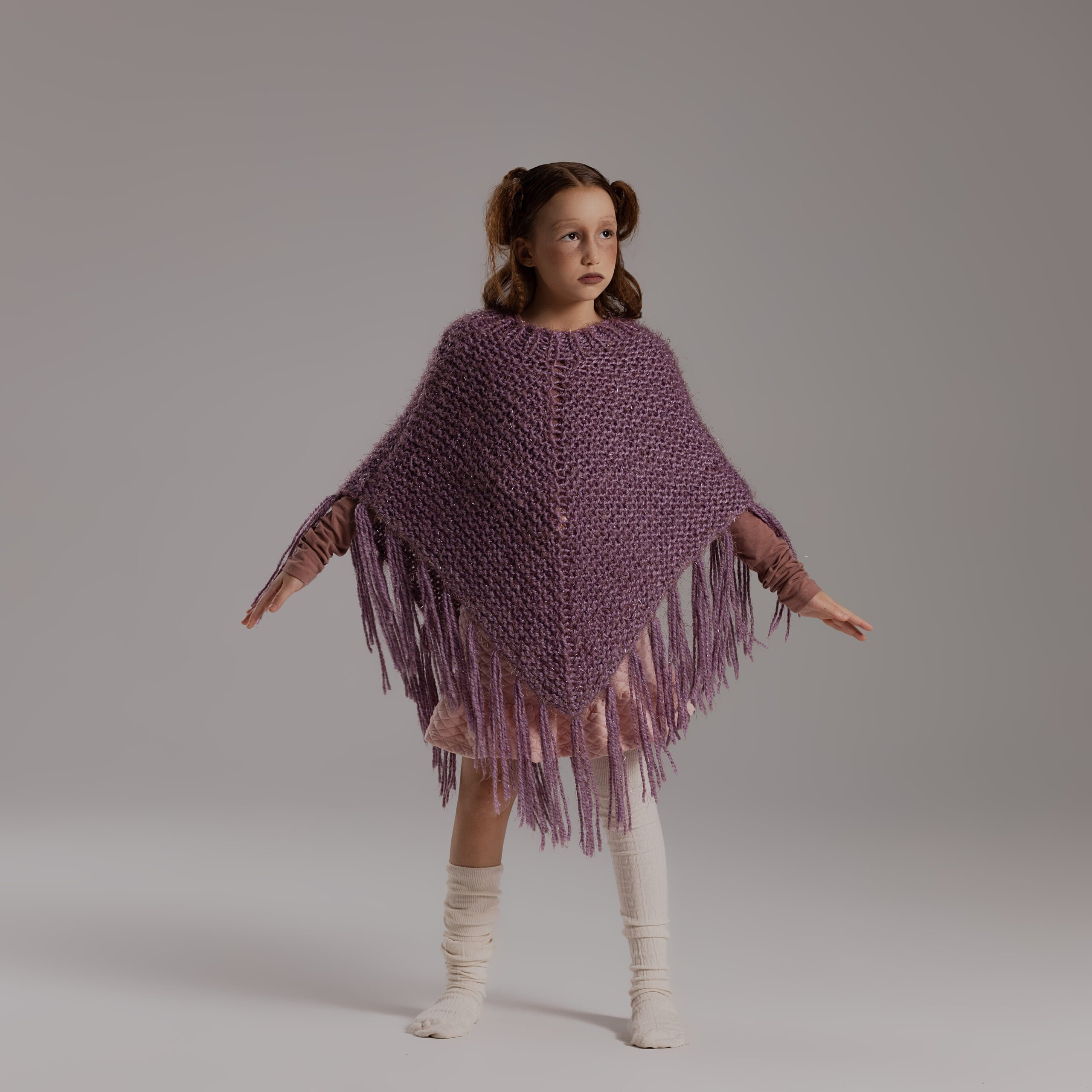 Knitted poncho with fringed hem, made from soft, shiny yarn.
