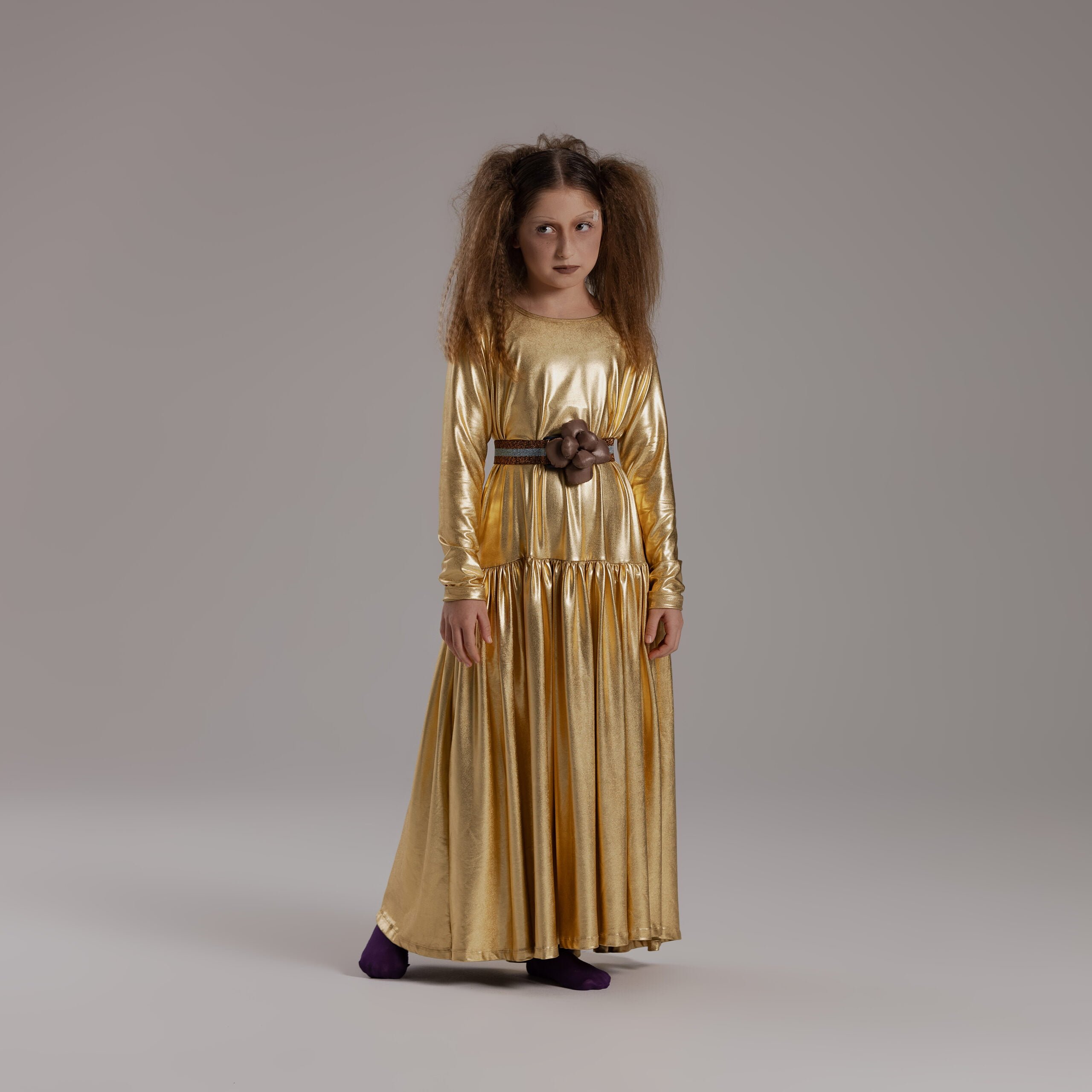 Maxi gold dress with ruffles from the waist down.